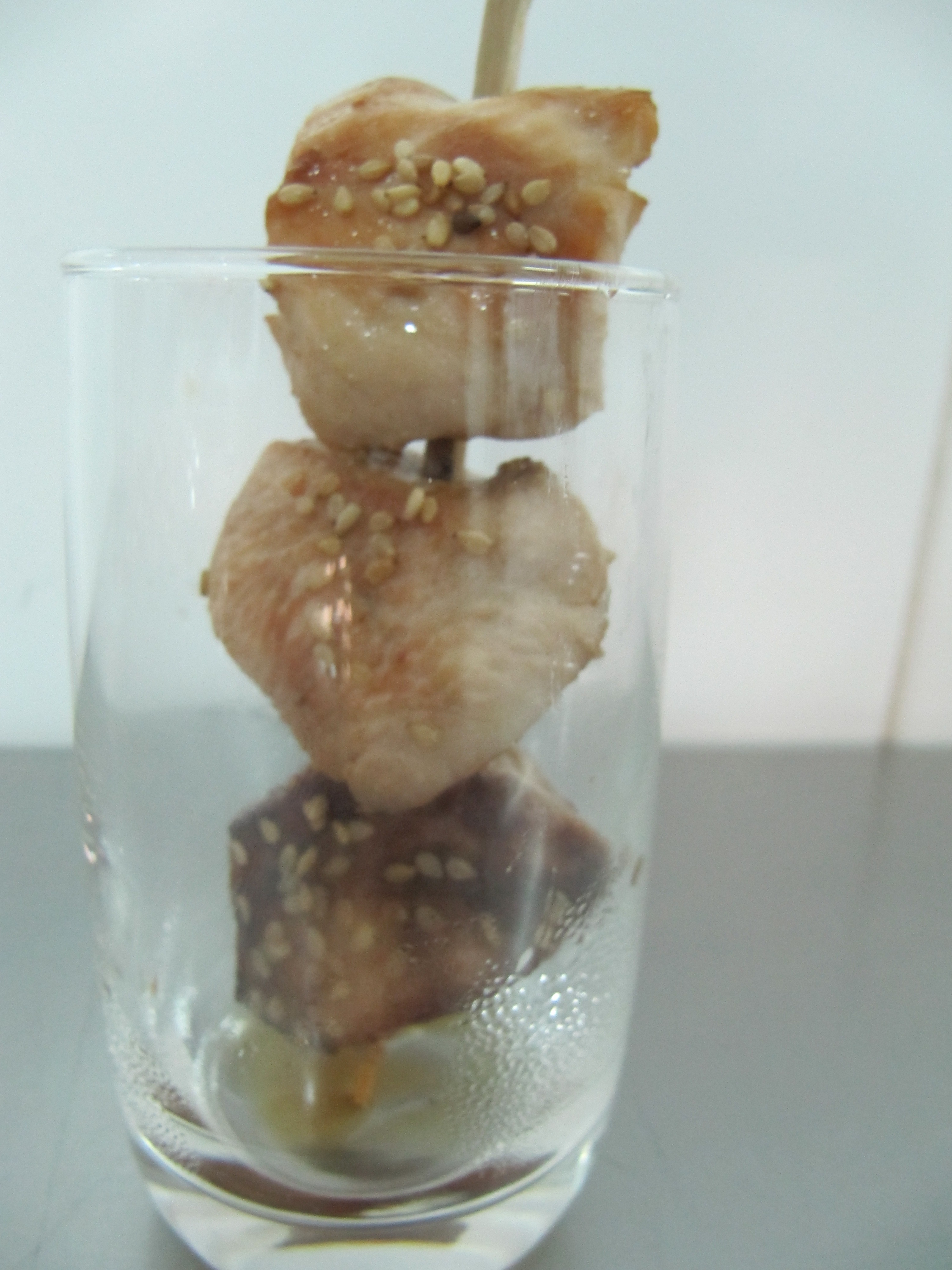 Brocheta de mango y cecina con vinagreta de almendra