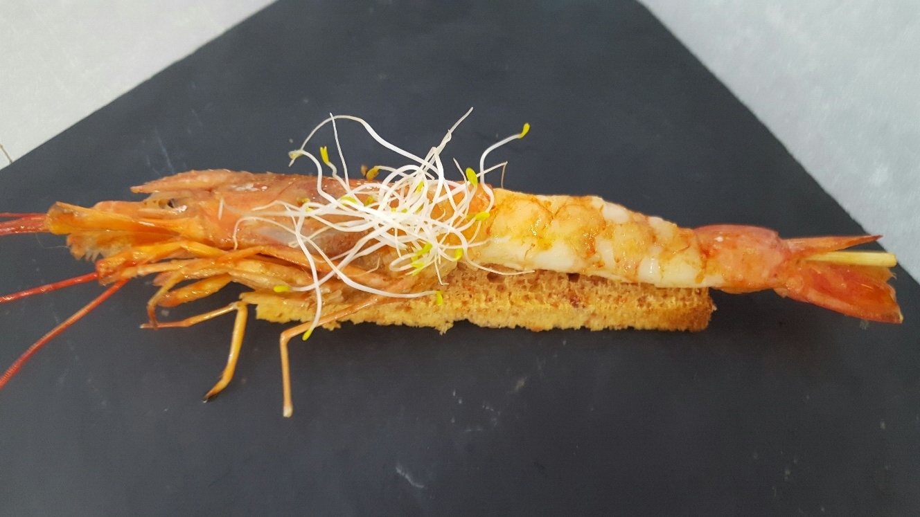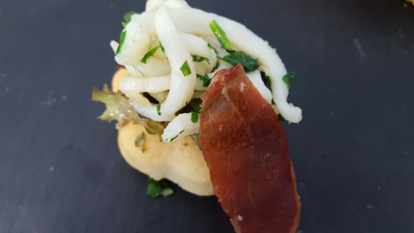 Bizcocho de tomate con gambón confitado