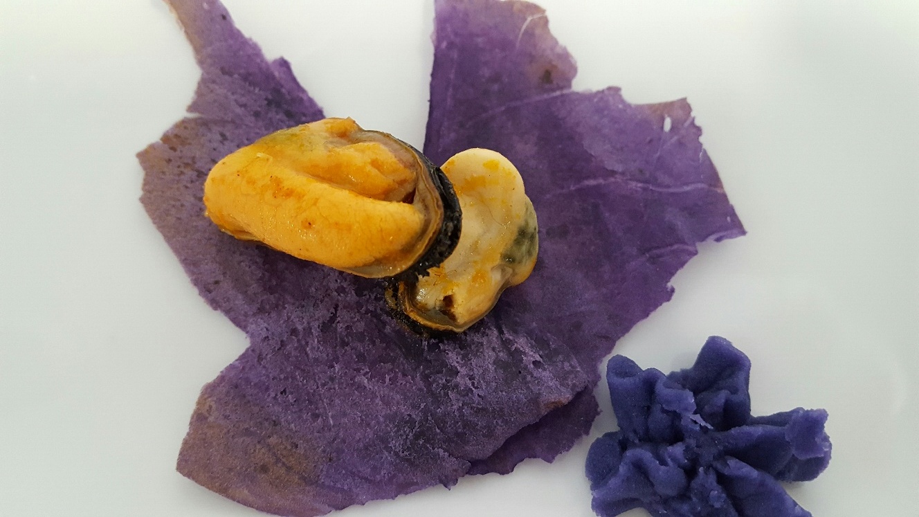 Mejillón en escabeche sobre texturas de patata morada