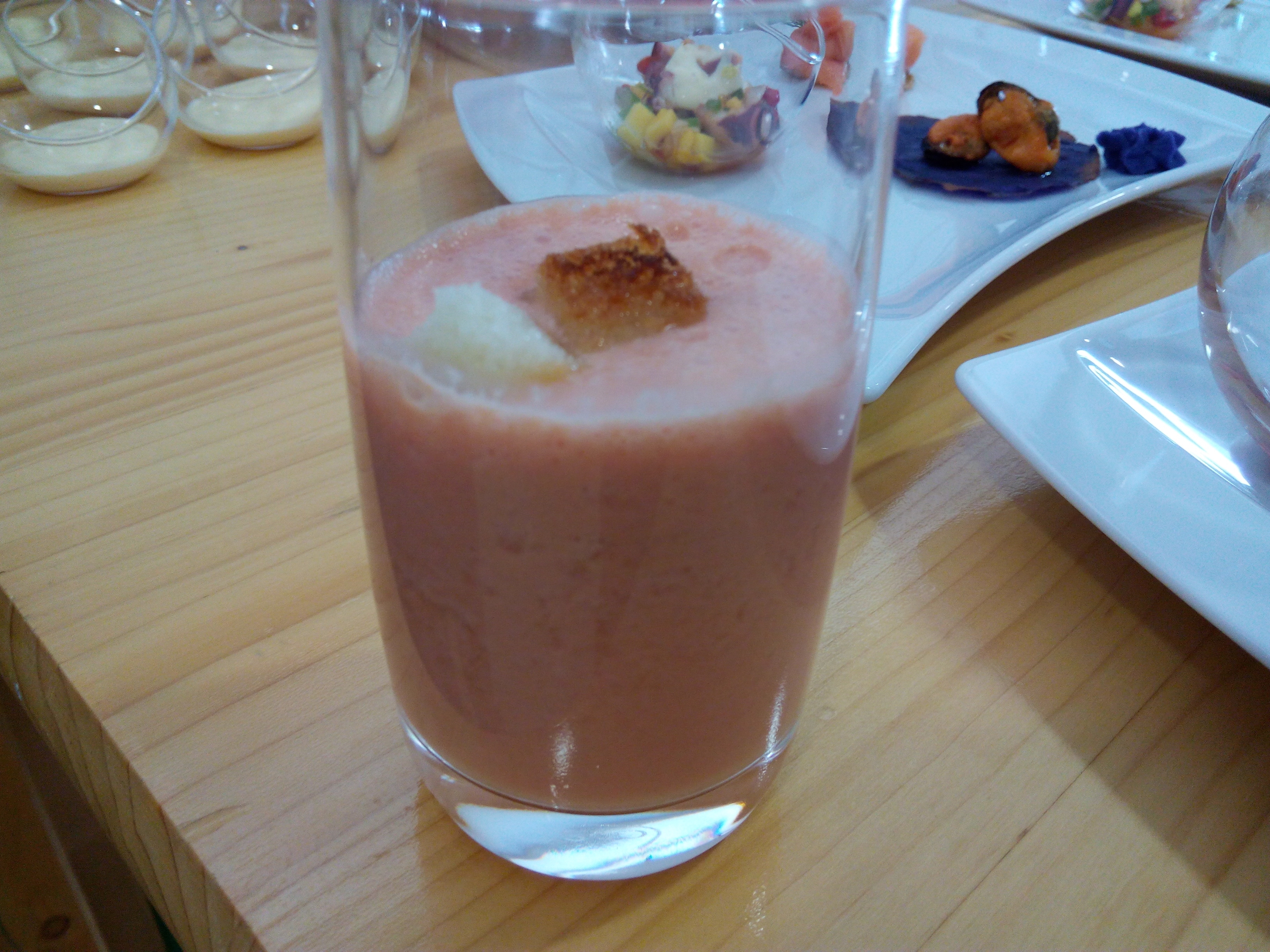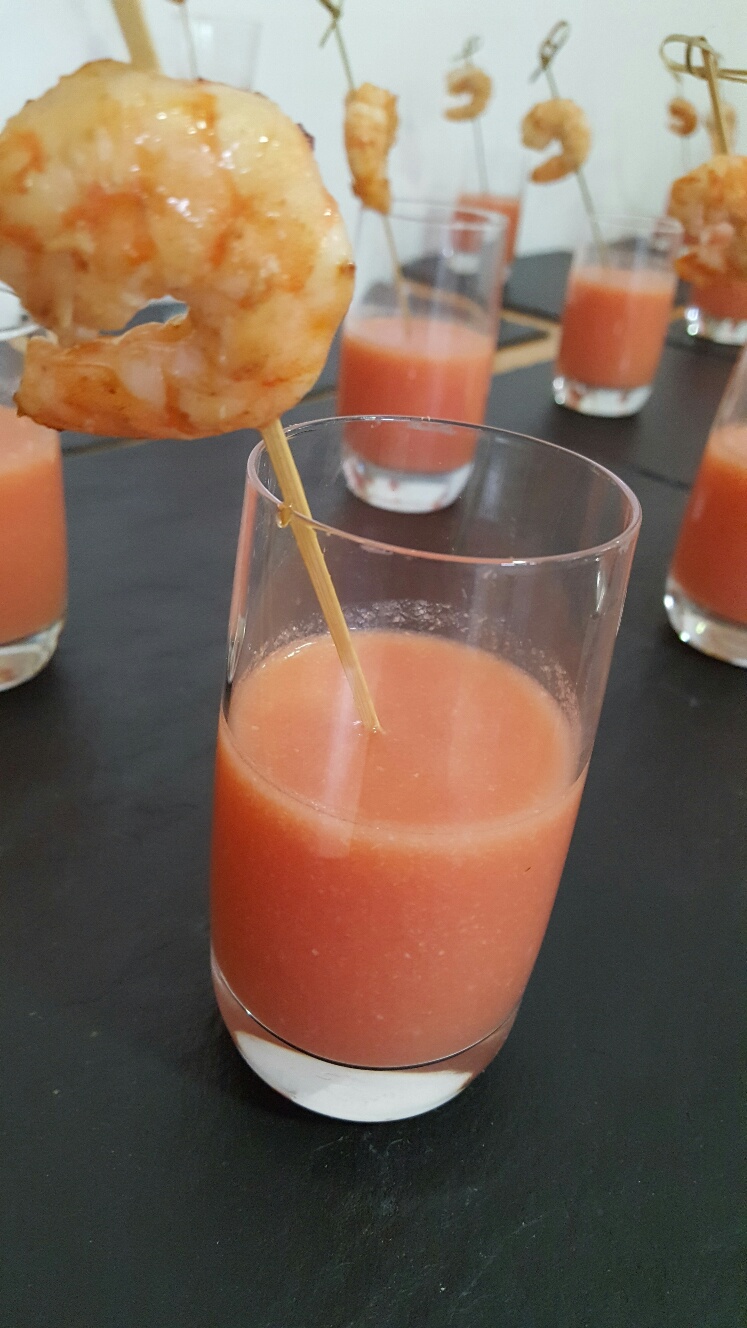 Salmorejo con brocheta de langostino
