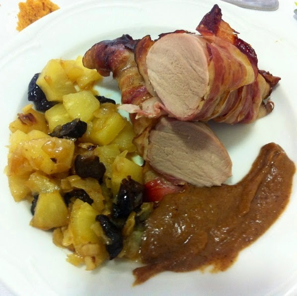 Solomillo de cerdo con cebolla, piña y ciruelas